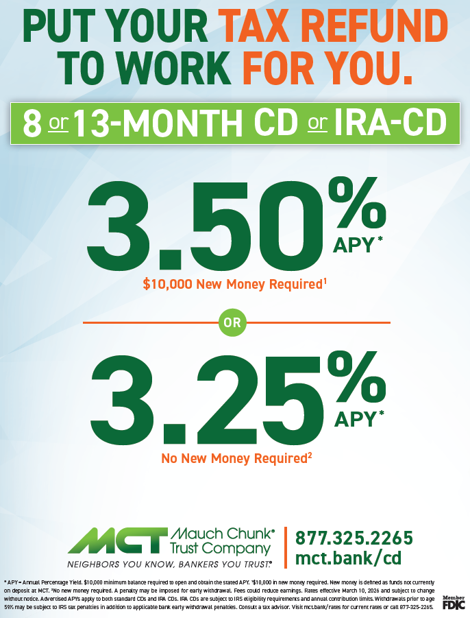 A penalty may be imposed for early withdrawal. Fees could reduce earnings. Rates effective March 10, 2026 and subject to change without notice. Advertised APYs apply to both standard CDs and IRA CDs. IRA CDs are subject to IRS eligibility requirements and annual contribution limits. Withdrawals prior to age 59½ may be subject to IRS tax penalties in addition to applicable bank early withdrawal penalties. Consult a tax advisor. Visit mct.bank/rates for current rates or call 877-325-2265.