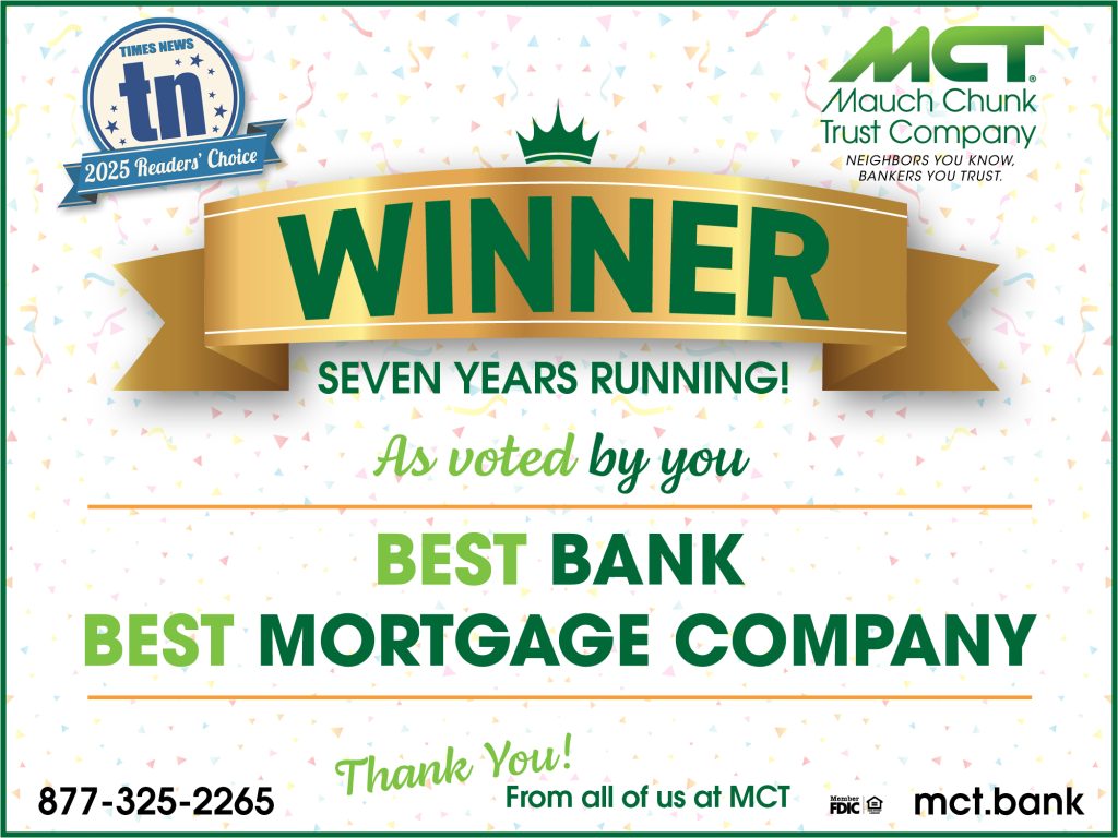 We’re honored! Thank you to our community for voting Mauch Chunk Trust Company Best Bank and Best Mortgage Company in the Times News Readers’ Choice 2025 contest – for the 7th year in a row!